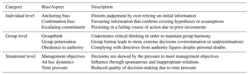 As the table illustrates, different weighing processes must be performed under uncertainty within the framework of a variety of modelling approaches. The people involved in this modelling process must carry out these weighing processes on the basis of their expertise. Their own expertise, consisting of experiences and the concepts developed from them, plays a crucial role, because people are bound to the cognitive processing cycle within the framework of their cognitive processing (Straeter, 2005). This states that an assessment is always based on concepts acquired through individual experience, and any mismatch between these and the information from the world is compared via a central comparator (the limbic system). The comparison always occurs both cognitively and emotionally. The emotional component means that mismatches are evaluated not only cognitively but also emotionally. This results in the devaluation of inappropriate information (under-trust), the search for confirmation of one's own experiences and concepts (over-trust) and the search for simplifications to reconcile one's own experiences and concepts with information. The way in which these simplification strategies take place is known in psychology as biases (Tversky and Kahneman, 1974; Englisch, 2024). Biases enable us to deal efficiently with mismatches in our environment based on our “gut feeling”. On the other hand, this effect grants us a degree of confidence based on our own experiences and concepts in a given situation, which is not necessarily valid.