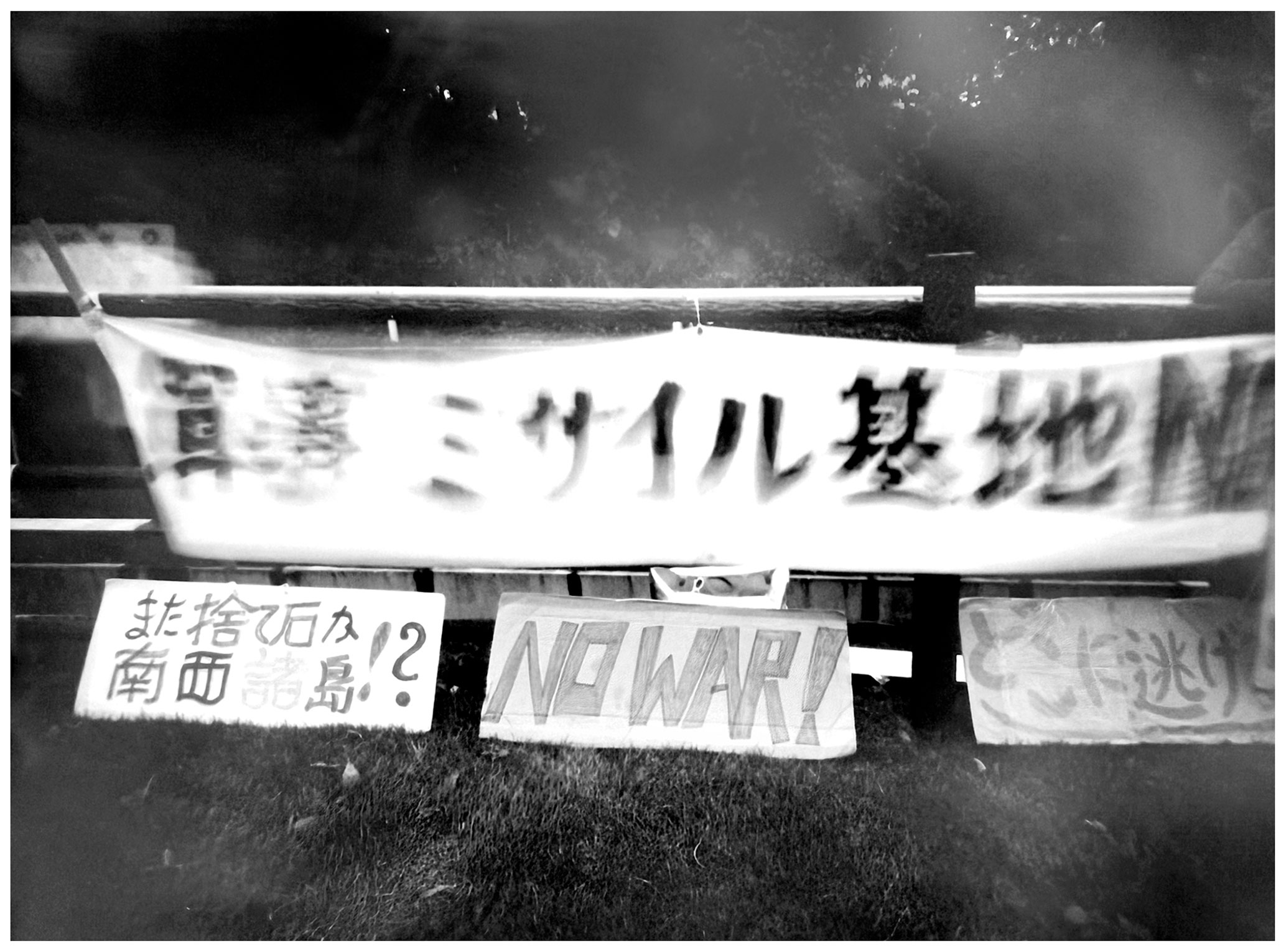 Listening to Seaweed consists of pinhole large-format analogue photographs that were taken in two seemingly unrelated locations: Hiroshima and Ishigaki Island (see Figs. 1–5). The resulting artworks attempt to connect these two places via the nuclear imperial histories and experiences associated with each; namely the World War Two (WWII) 1945 atomic attack on Hiroshima and the present-day bolstering of Japanese military capability, which is evidenced by the newly developed (2023) Ground Self-Defence Force (GSDF) base in Ishigaki. The resulting photographs focus on a series of hibakujumoku trees (trees that survived the atomic bombings of Hiroshima and Nagasaki), protests, and shorelines impacted by GSDF in Ishigaki5. This series also explores how the material and indexical properties of film may be employed to visualize invisible trace radiation. I am interested in how filmic emulsion can literally record, and thereby witness, what remains invisible to human senses, meaning radiation residue and military pollution. These ideas are extended by devising film-developing methods where exposed film is processed using developer that has been made from seaweed gathered from the ocean current of the Fukushima wastewater release.